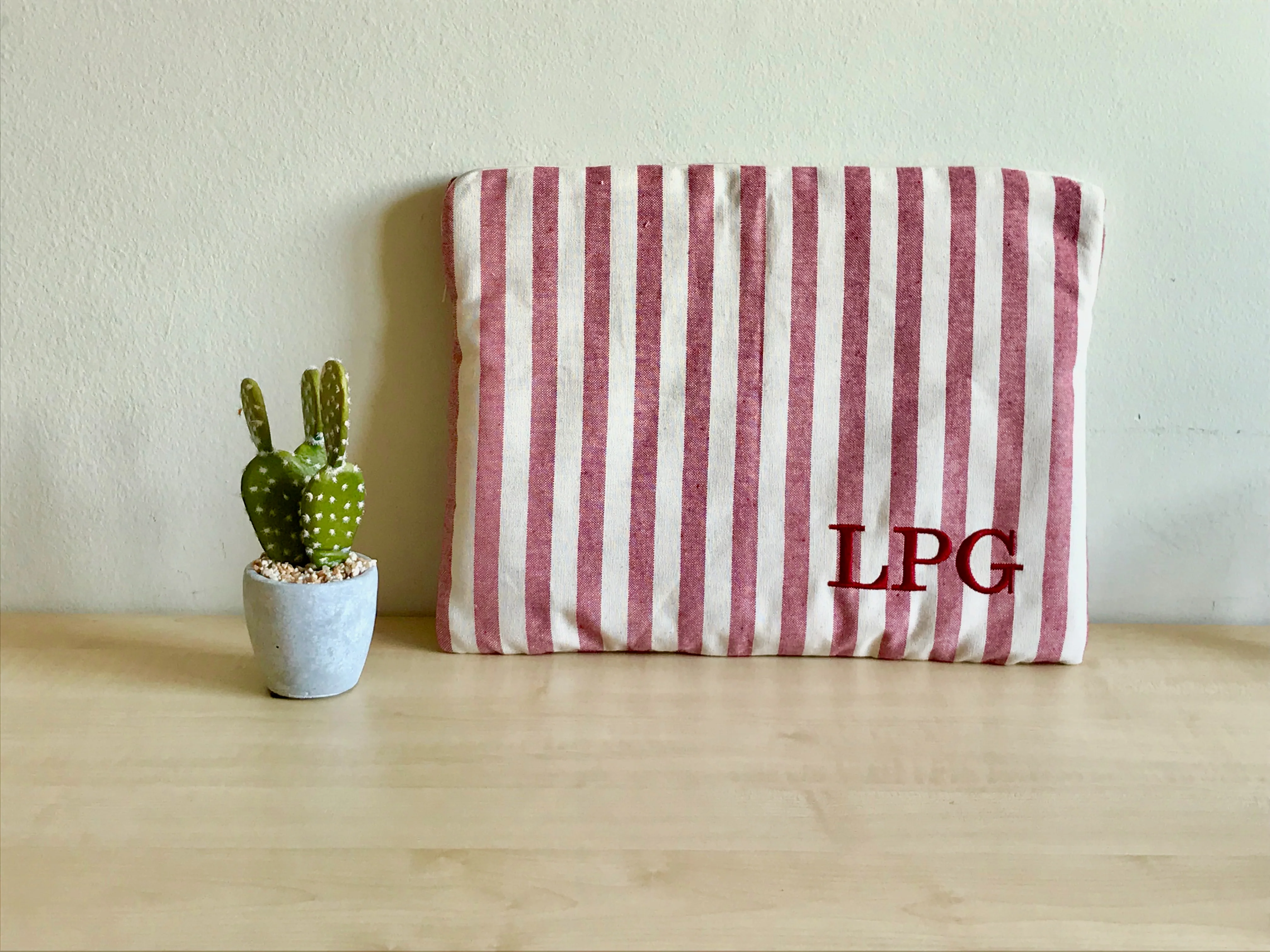 Funda personalizada de tela de rayas rojas. Iniciales bordadas color verde botella. Elige el color de tus iniciales y crea tu propia combinación.