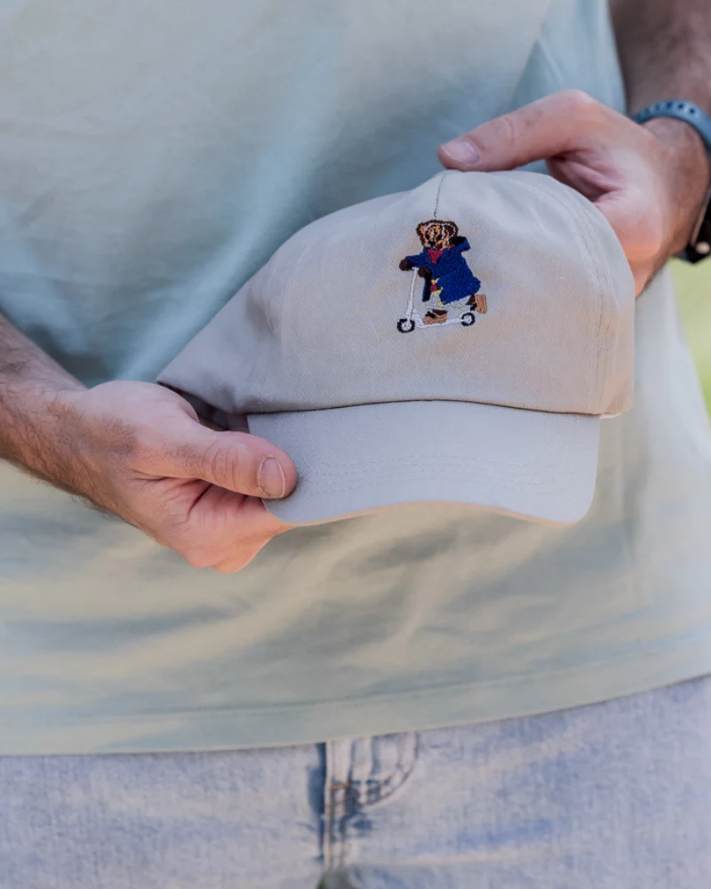 Gorra con visera en color beige bordada con una palabra y el dibujo de un oso en patinete.