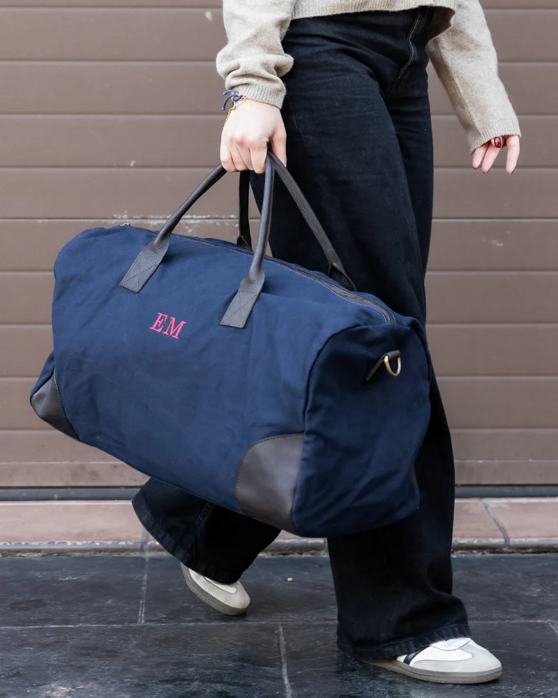 Confeccionada en loneta en color azul marino con asas en piel marrón chocolate. Un básico atemporal que nunca pasará de moda.