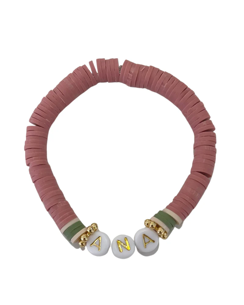 Pulsera hecha a mano de abalorios de color con letras doradas en el centro. Hecha con goma elástica y adaptable a cualquier muñeca.