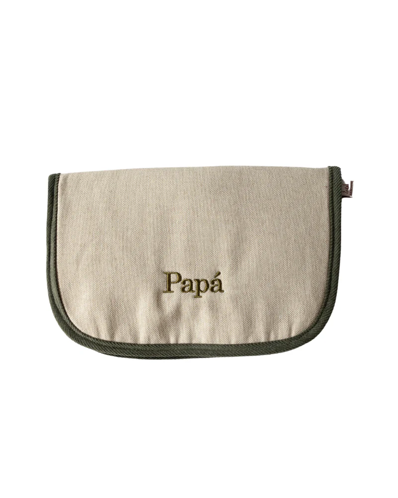 Relojero de viaje de tejido de algodón en beige y verde con parte interior a juego. Tiene cierre mediante imán y un bolsillo interior con tres compartimentos para llevar 3 relojes.